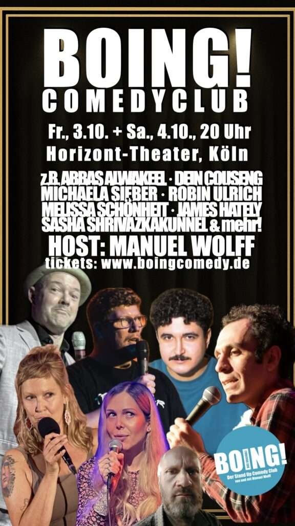 Es gibt viele Comedyshows, aber es gibt nur einen BOING! Comedy Club. Wegweisend in Köln seit 14 Jahren. Mit bester Atmosphäre im Horizont-Theater. Hier bist Du richtig! Tickets gibt es hier.